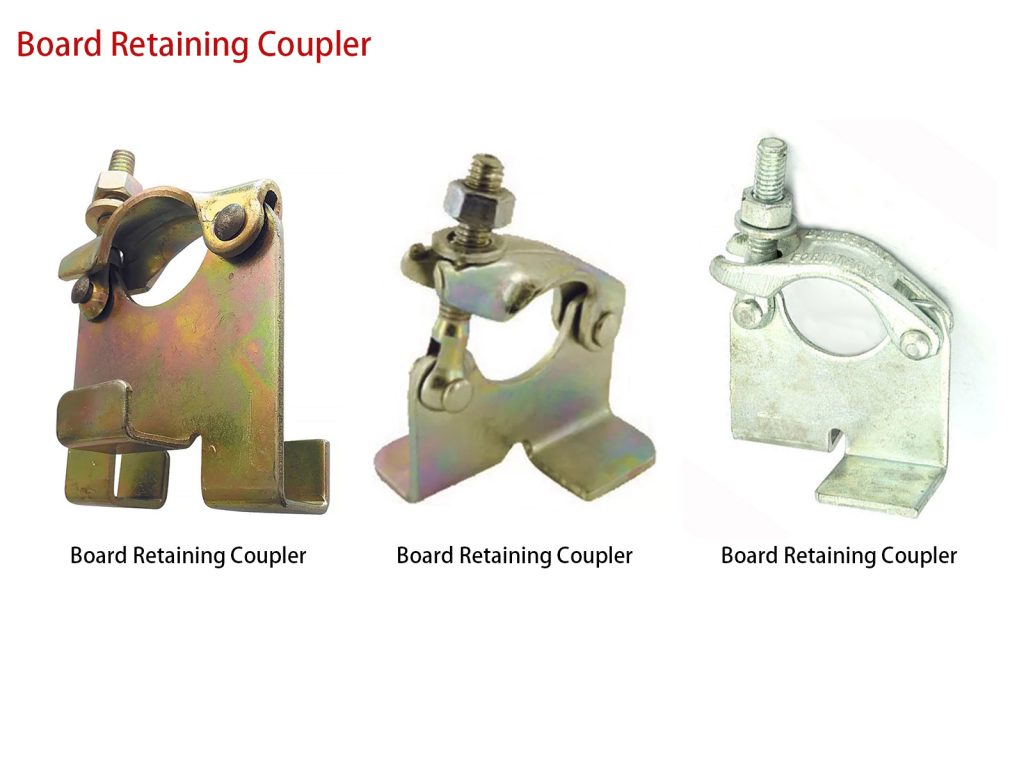 Board retaining couplers are used to erect and secure scaffolding platforms during construction, ensuring that decking remains securely and stably attached to the scaffolding structure, preventing it from slipping or shifting during use. Common board retaining couplers are made of high-quality, corrosion-resistant steel, offering exceptional durability and a long lifespan, even in harsh working environments.