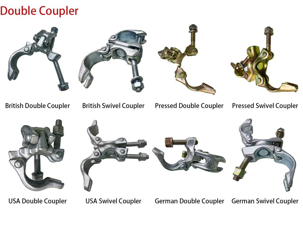 Swivel coupler are a pair of high-strength scaffolding clamp that rotate 360 degrees and connect two steel tubes at any angle. Swivel coupler are suitable for steel tubes with diameters between 48mm and 51mm and are typically used for diagonal bracing. They can accommodate various angles found in stairs, handrails, ramps, and supports.